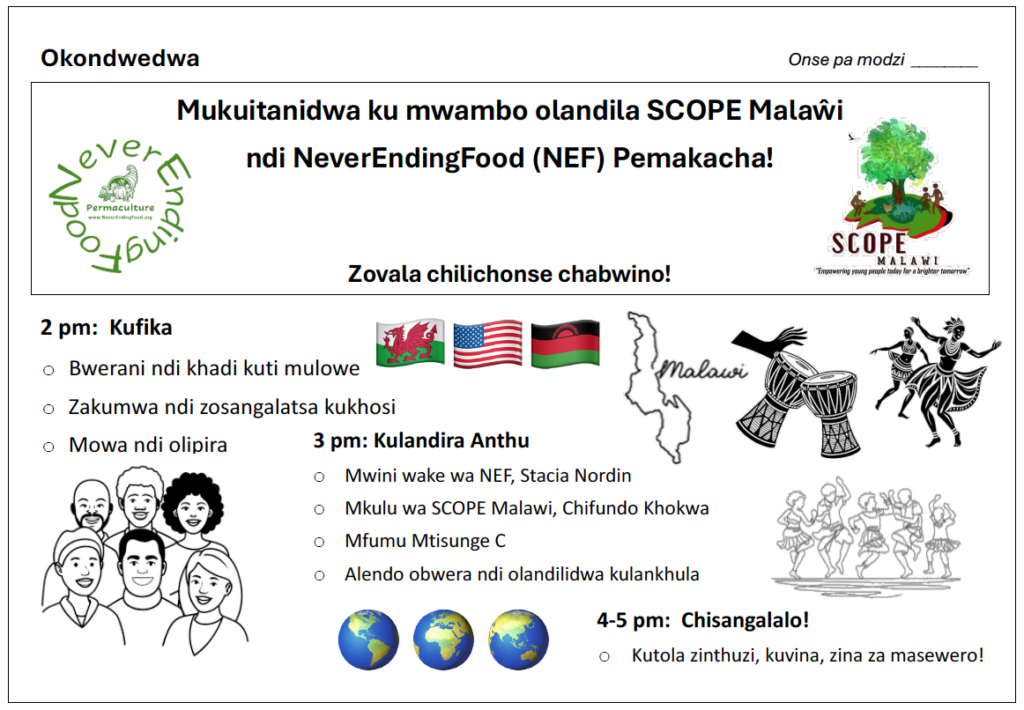 We are having a welcome party for SCOPE with our community next week. We will clarify what the new arrangements are and celebrate that NEF will be a NeverEnding resource for our community, the Permaculture Network in Malawi, the nation, and beyond!