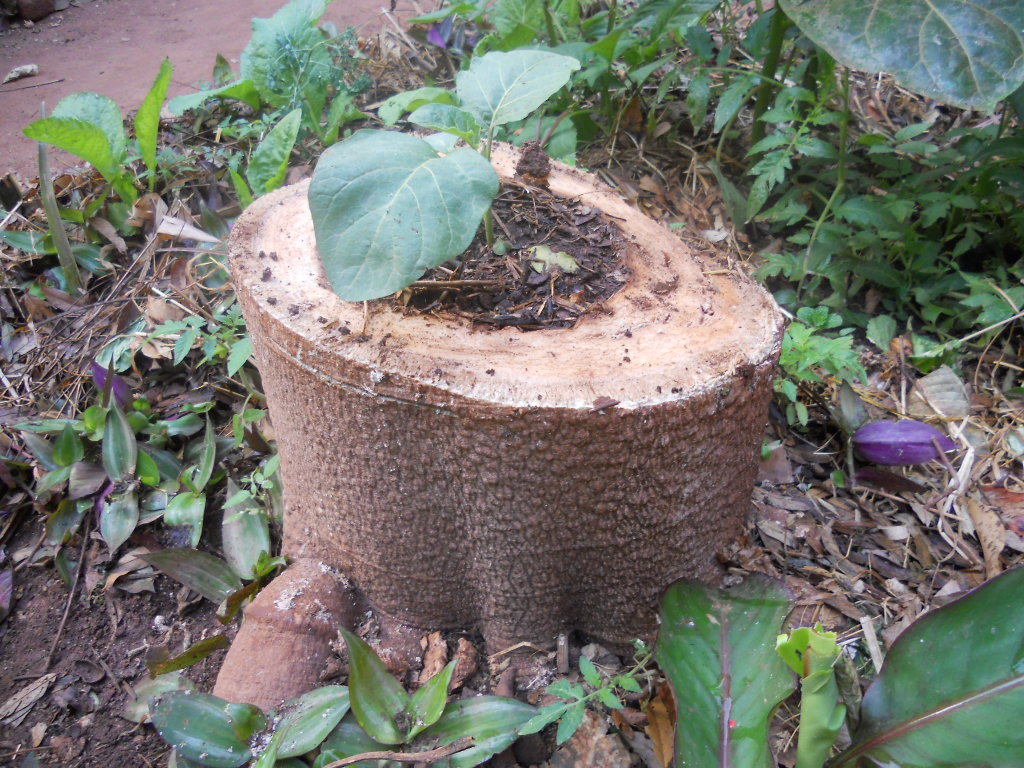 One of Permaculture’s main principles is to “use resources to their fullest potential.” The following is a good example of what that means…We recently had to remove an old papaya tree from one of our garden beds, so we chopped it down to the level of a stump. Papaya trees tend to be very soft or hollow on the inside, so instead of trying to remove the stump, roots and all, we left it in the ground and turned it into a natural planter. We hollowed out the middle, filled it with compost and planted an eggplant. By doing this, we will be able to allow for the natural decomposition of the papaya’s roots that will leave small ‘tunnels’ in the soil to let air and water penetrate deeply. It will also allow the stump to feed the soil around the area of the planter as it decomposes, adding carbon and essential nutrients back to the soil. This whole process also helped us to “conserve energy” (another Permaculture principle), since we didn’t have to go through the back-breaking process of trying to remove a large tree stump from the ground.
